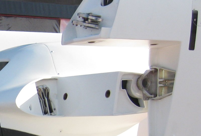 Close up of the wing fold. That opening forward and below the hinge is probably where the power wing-fold mechanism goes. They had to delete that to cut weight for LSA. But the two paddles are a slick way to get the flap and aileron pushrods out to the outer wing without having to reconnect anything.