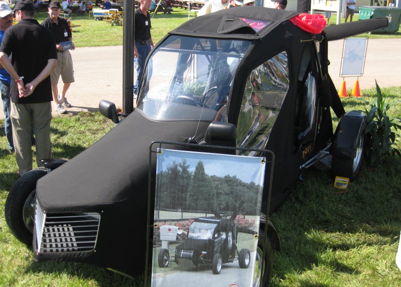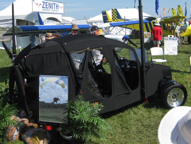 I had to ask the guys - yes, the wing is stowed in that zippered flap in the roof. Yes, the wing is already packed inside. Doesn't look all that bad as a car. Not sure if it's LSA, as it appears to have a back seat for carrying 4 people. Their secret is that 6 inch diameter 25-foot radio antenna. It holds the flex wing to a known position over the vehicle so there is no ground run lost in lofting the wing up over the vehicle, and it has what normal flex wings don't - crosswind capability. There is also a semi rigid spar in the flex wing, which is steerable to a degree - so they can crab the wing relative to the fuselage/car for crosswinds.