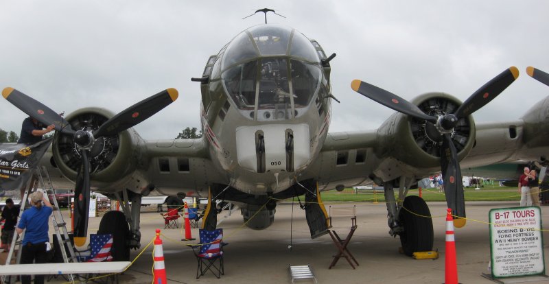 B-17, G model. If I hear another airshow announcer say it's the Flying Fortress because of its mighty defensive firepower... In the mid-1930's, the Army could only get funding for a bomber program by selling it as a coastal defense weapon. As in, it would bomb ships, extending the reach of the forts along the shoreline. Thus the Flying Fortress. Nothing to do with defensive firepower, or any other firepower for that matter. The earliest models (stuck with what was a bad joke of a name at that point) didn't have any forward defensive guns. Didn't take long for the enemy to figure out, just attack these things from the front. But they weren't designed as strategic bombers. The program couldn't be and stay sold that way (strategic bombing was not a viable concept in the 1930's U.S. military establishment). In fact, we were lucky that Boeing went out on a limb to design a four engined bomber, nearly bankrupting the company when it wasn't accepted for production. The prototype took off on a test flight with the gust lock installed, it crashed, killed two people, and disqualified itself from the competition. So a much lower performance, slower, lower-payload twin-engined bomber got the production contract. Much to the delight of the Navy, who at that point wanted the Army to challenge their supremacy at sea as little as possible. But world events occurred which allowed the Army to bring Boeing back from the brink. But when you think Flying Fortress, think airborne coastal defense fort.