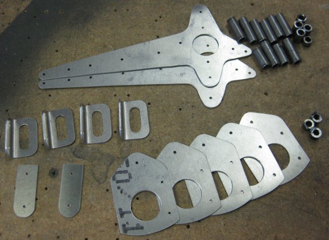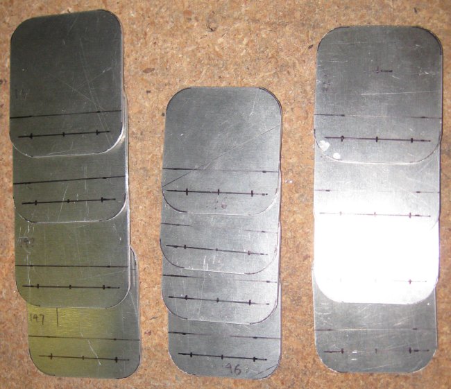 1/2 hr - laid out the 12 brackets on this page, cut them out on the bandsaw, sanded and scotchbrited the edges. Will lay out the holes and bends later.