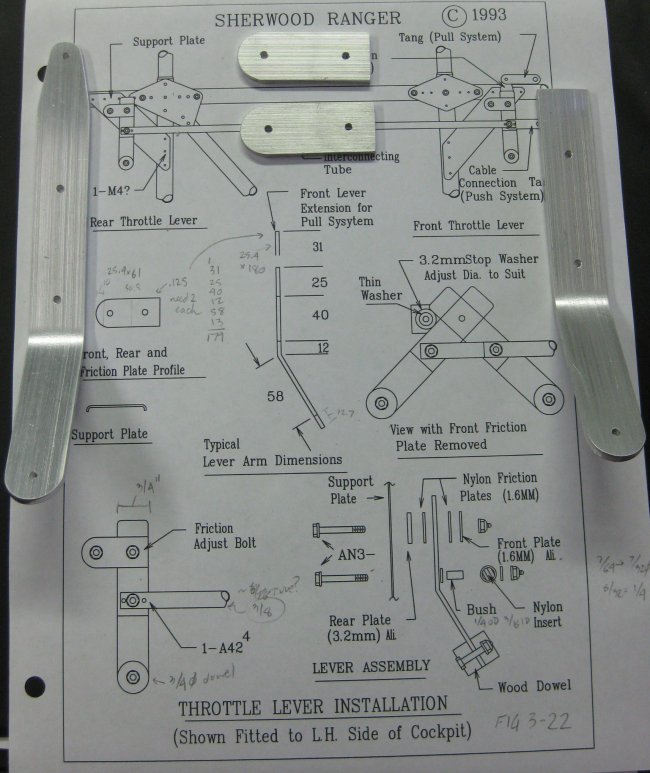 1/4 hr - pulled the two pages from the build book with additional parts. Started laying out the throttle handles at 1" wide, but in scaling parts on this page (not all dimensions given), realized they are actually 3/4" wide. Re-scaled everything from that and realized I didn't have to drill out rivets from an old Sonex part to free up some .125 - that I had a 3/4" wide strip of it from some old angle stock trimmings. So laid out the parts. No cutting or drilling yet.