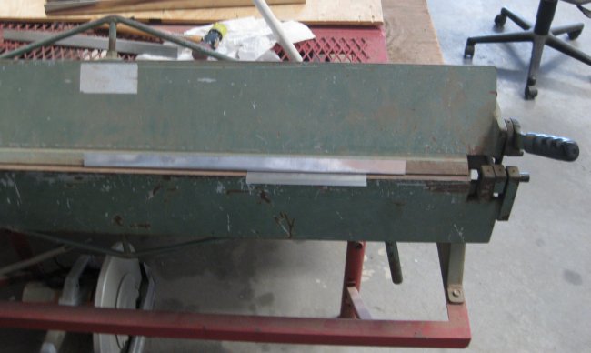 Small part in the brake. Strip of scrap over the clamp-down bar to create a larger radius. Didn't use this on the long, thinner parts, as the smaller radius was good for those.