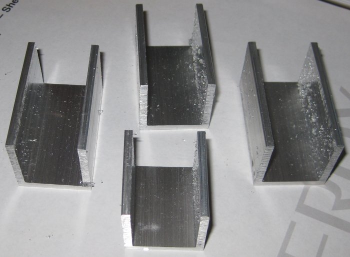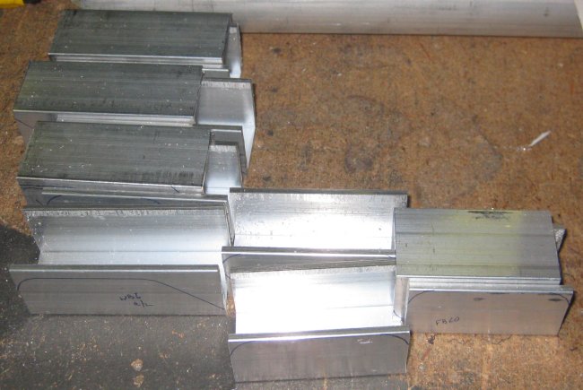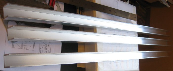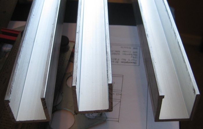 1/2 hr - marked the two routered 3-foot segments for cutting into many smaller lengths and cut one of the 3-foot segments to part-lengths. Cut easier than I thought - just start the cut at the open end of the U, and down towards the flat across the bottom of the U. I thought I might have to rotate the extrusion in the saw, but it just cut through the 1.25 wide section at the bottom of the U - slowly, but it cut it no problems.