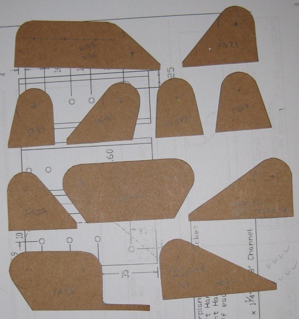 1/2 hr - made cardboard patterns for the profiles of the parts. Some of the profiles repeat many times, with differences in the hole pattern in the bottom of the channel.