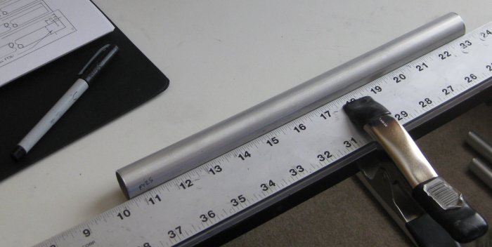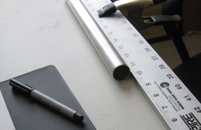 1 1/2 hr - Moved the old drafting table into the office, as well as a box of tubes. On the edge of the table, spring-clamped a length of .250 thick stock and one measuring stick. This was a good thickness for marking a line down the .625 dia. tubes. Did all those (not the whole length, just at each end where the holes will go). Then added another measuring stick to the stack and did most of the 1" and 1.125" dia. tubes.