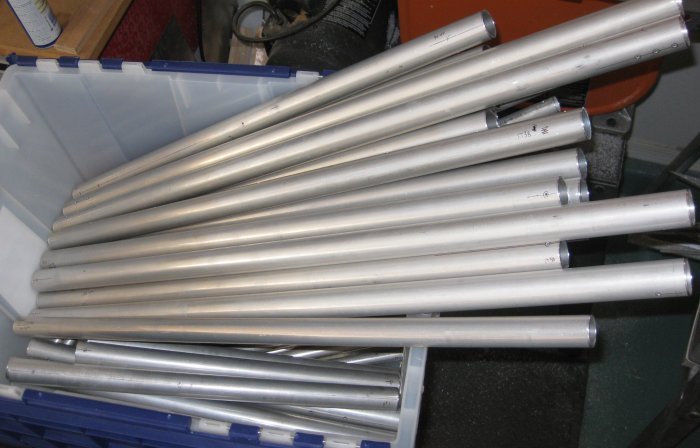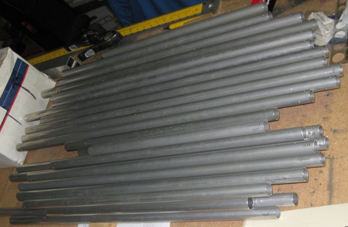 1/4 hr - marked 2 more tubes. That's it, for the initial fuselage/tail batch, except for maybe a dozen really short doubler (sleeve) tubes, and the 4 tail longerons. Brought the 4 tail longerons inside, but not sure I can mark them in the room where I did the rest. Also need to smooth off the short tubes, as I cut those on the bandsaw. Found a ~$50 lathe on Grizzlyindustrial which may be possible to use to put the chamfered ends on the several tubes that call for that feature. 8.75hr so far in marking tubes for drilling - about 2x quicker than I was projecting based on the first few that I did.