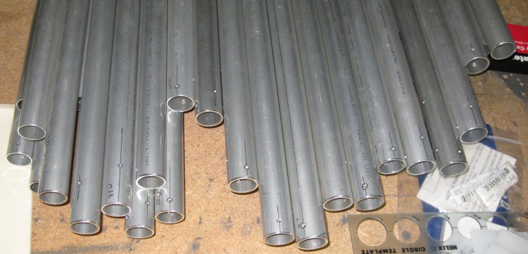 1 1/2 hr - marked 29 of the .625 tubes, and identified 2 that are to be drilled at assembly. Did these more assembly-line style - mark all 180 degree marks using the marking tool. Then extend all 180 degree marks up the tubes. Then measure and mark all hole locations along the tube. Also probably helped that all of these have the same hole pattern.