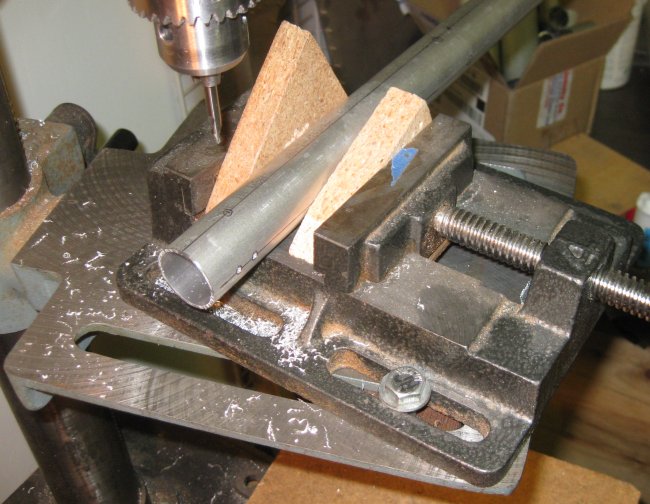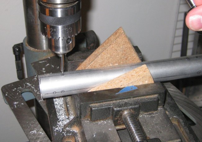 1/2 hr - marked up a sample tube (cutoff scrap). Tried out the center finder. Seems to be pretty easy to get the vise centered correctly on the drill press to hit the center of the tube. Then tried the center drill on a few holes. A bit slow to get the holes lined up, but at least with the center drill there is no wandering of the bit - it just goes right into the tube.