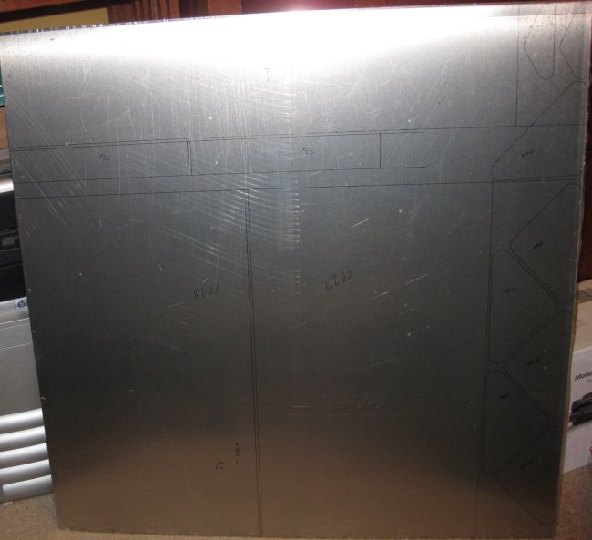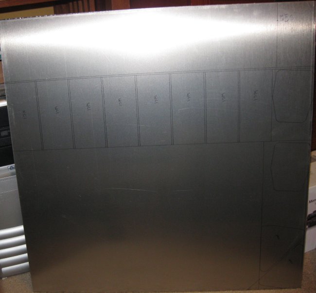 2 hours - 38 parts, not bad. I count 74 .063 parts total. Now it's onto sanding, scotchbriting, marking, and drilling (and a few bends).
