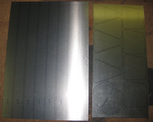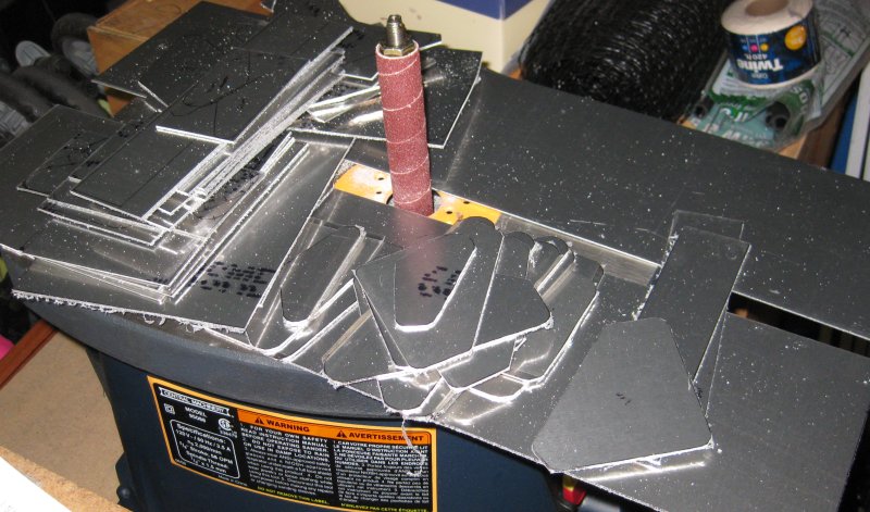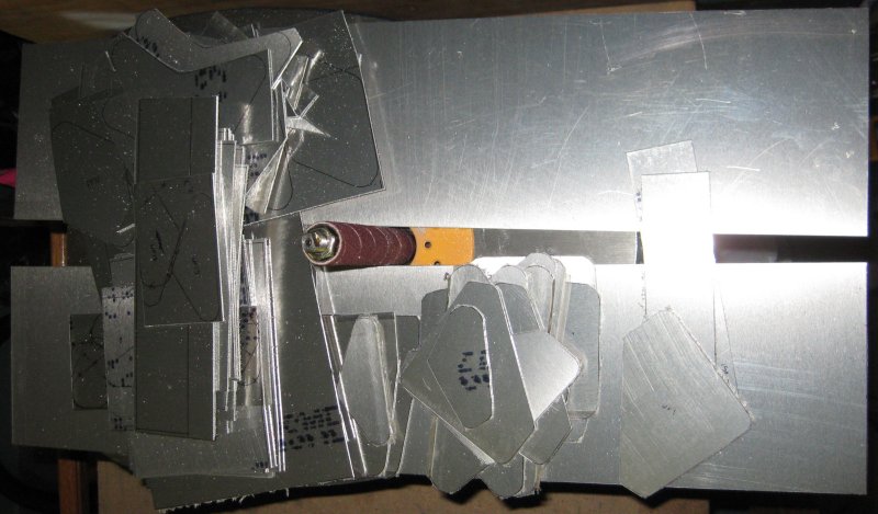 1 3/4 hr - started by finishing off a few .040 parts, then the rest of the time taking the .050 2'x2' squares down to size. The blade walked off the bandsaw drive wheels after a while, so I adjusted the tracking by turning a screw that angles the axle of the top wheel in the saw. MUCH better. It holds tight to the guide blocks and bearings now. The pile of .050 parts looks surprisingly small after being cut from 2 1/2 of the 2'x2' squares. There's still a few more to finish off, but I got through well more than half of the cutting.