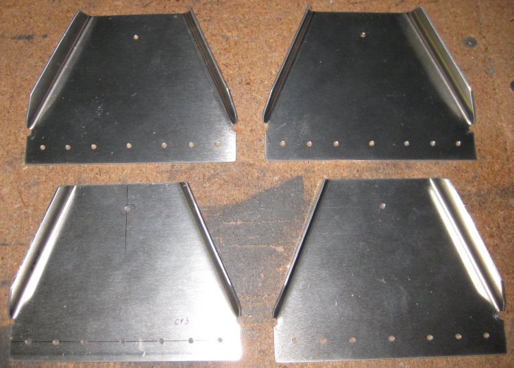 1 hr - drill hole pattern in initial part, cut perimeter, drilled through on the 3 copy parts, marked their perimeter cuts. Cut all, sanded/scotchbrited edges, bent the flanges on these. The drawing is a little cryptic because it says to cut after bending. This seemed a little more complicated to me than to just cut then bend, plus I drilled .188 stress relief holes at the bottom end of the bends.