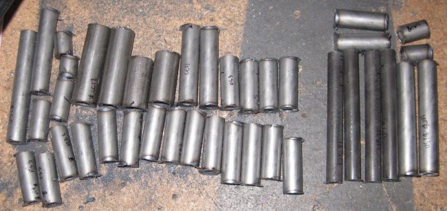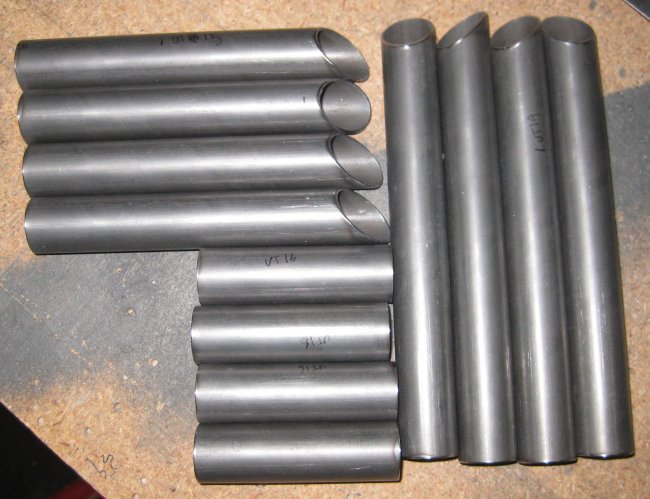 1/2 hr - finished cutting the .75 diameter parts. Deburred the ends on the bench grinder and filed the burr off the ID of the cut ends. Still need a hole saw or other method to cut the fishmouths.