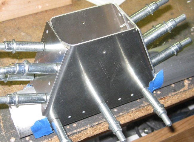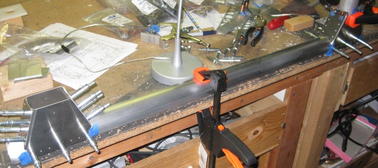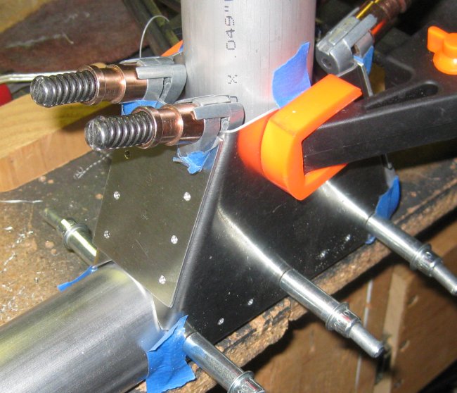 Aft end in process. Scrap of 1.75 dia. tube to inside the assembly to set the spacing of the stick mount plates.