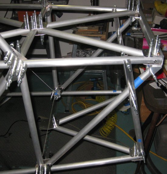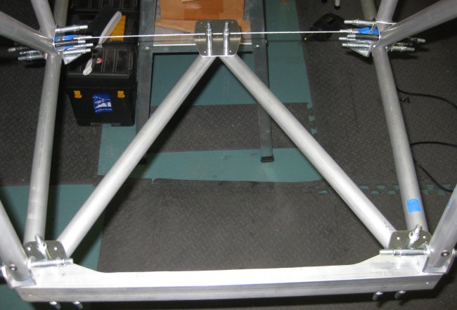 Forward triangle of lower X, with string across the FT26 tube brackets to compare alignment of brackets on lower longerons with the holes in the central gusset plate.