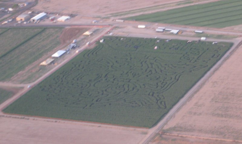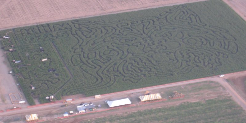0.6 hr, 1 ldg. Flew down to the Buckelew Farms to see the corn maze. I don't know why I didn't think of this last year, but they do a pretty impressive corn maze. This year it's the U of A mascot. I don't know if last year's is what is on Google Earth, but the one last year is SE = up, so when you zoom in on it, it's next to impossible to tell that it's a dragon. There's an NDB right across the street from the farm, and the GPS showed it on the screen, so it was pretty easy to find (and stay out of the KRYN class D).
