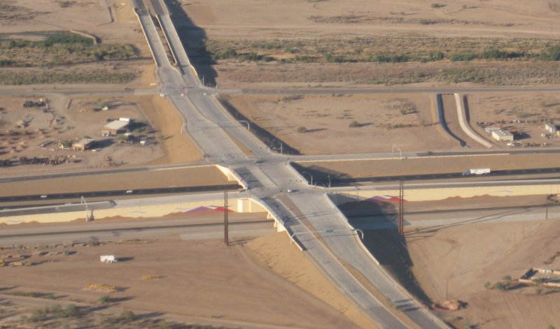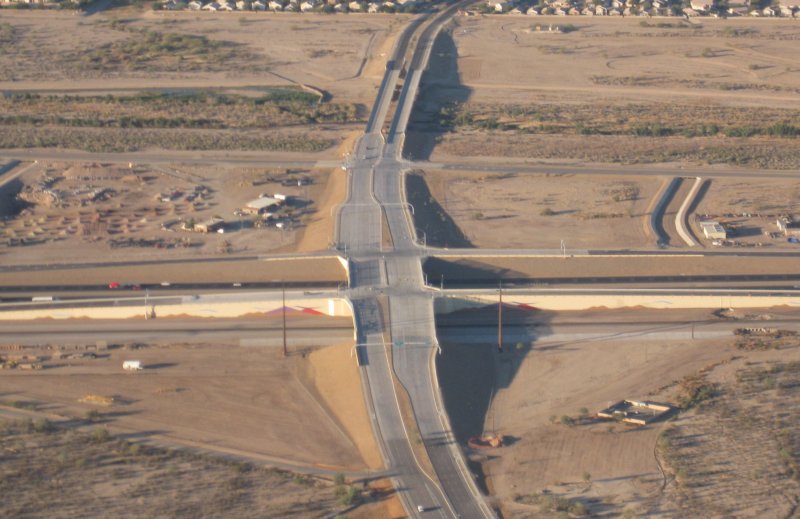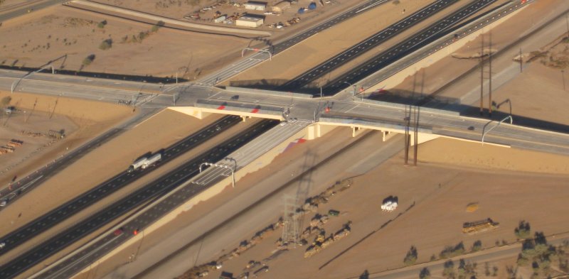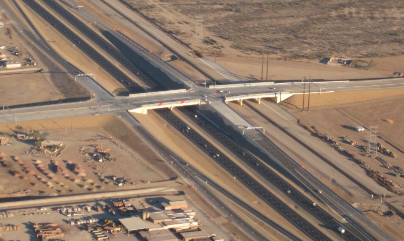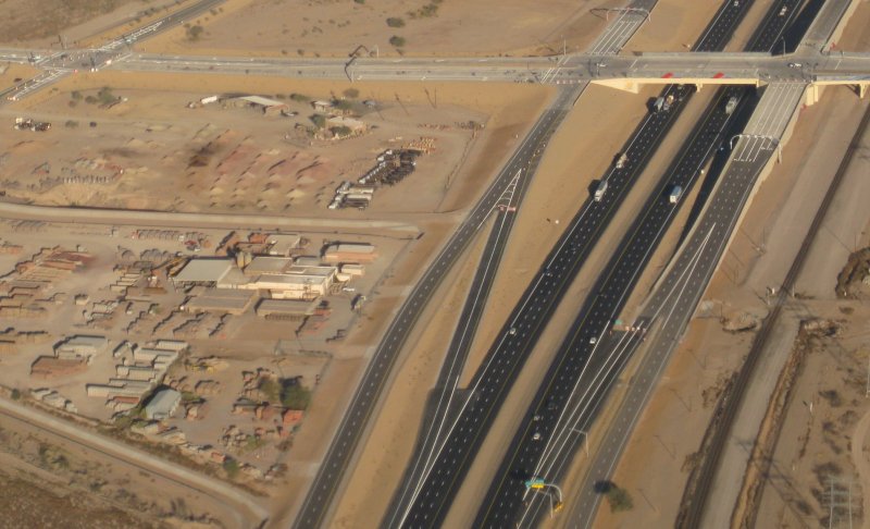 0.4 flight time, 2ldg. -2C reported on takeoff, engine started right up. Over to the I-10 project - project is over, so today's photos are the road in service. I was among the first to drive it, arriving 5 minutes after opening at 6am last Friday. Then circled the house once, and out west for a few steep turns / lazy 8's. Then back to the pattern. The incomprehensible Diamond was calling into the pattern somewhere. Found him on the ground taxiing out. Apparrently he was doing full-stop and taxi back patterns. I did a power off touch & go. Saw nearly 2000 fpm on departure, though it was a bit of a "zoom" pull up. Made the pattern large, but obviously not large enough for that super slow-mo extra-big-pattern Diamond. I did 2 360's on downwind, and still that wasn't quite enough. I bet half my flight today was that one pattern, hanging out behind the Diamond. So normal landing and taxi back. Added 9gals before the flight.