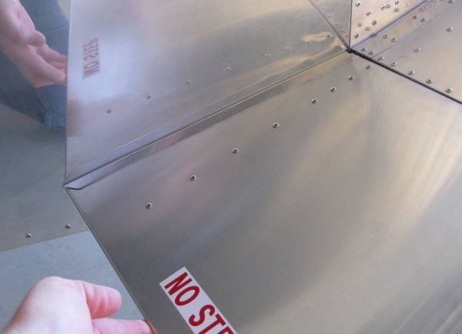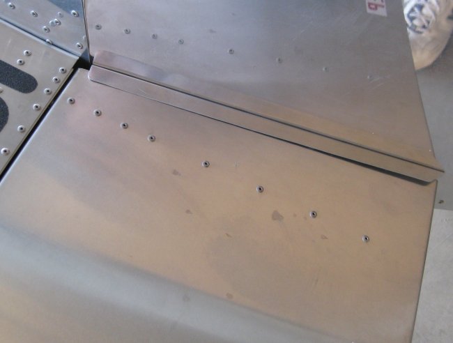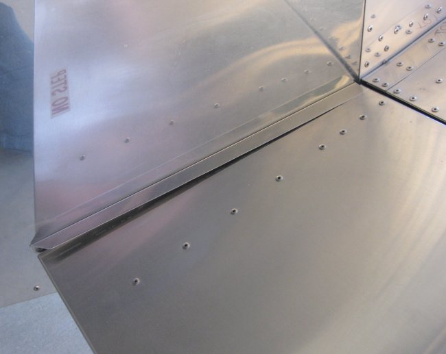 Finished installing the flap gap fairings, yes! Stopped by on the way to work with the trunk loaded with tools and fasteners. Ended up taking loose the flap to pushrod attachments to access the forward two rivets on each side. At last those parts are in the right place. Installed them upside-down relative to the plans, as seen on someone else's plane to hide the attaching flange.
