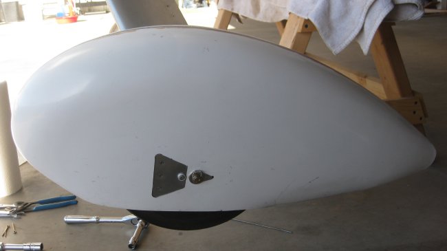 Cleaned up the epoxy squeeze out. Located and drilled the hole for the Southco fastener. Went looking in my bin of fasteners for one the same length as the other side and didn't have one. So tried the next one shorter. By some luck, that fit just right. Now, to put them back on the plane. Oh wait, got to flip the tires on the rims while the pants are off.
