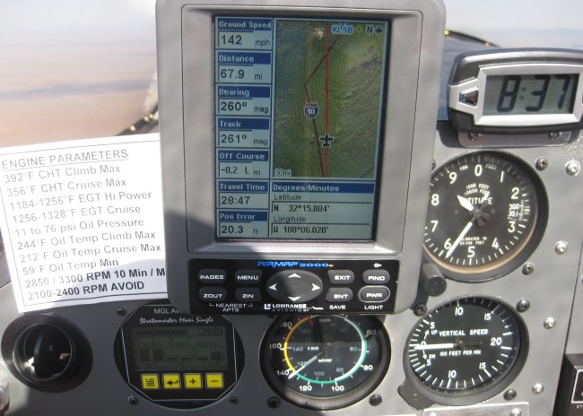 1.7 flight time, 1 ldg. From KAVQ to KDMN, 191 nm. Wheels up at 0629. Landed at 0757. First leg of the proposed Oshkosh trip. Went pretty well. Called TUS approach off of KAVQ, got a xpdr code. They handed me off to ABQ center around Benson. I didn't hear center at all. Turned the squelch back down and tried again. Yes, there they were - much quieter frequency out of the Tucson valley. There's a LOT of FM radio "resonances" or something that come through the radio in the valley. Held 7500' all the way over. The Aeroplanner flight plan was RIGHT ON. Legs to the minute. Pretty cool. Fuel burn estimate at 5gph was pretty close as well. Ran about 2950 rpm, and was seeing ground speeds on the order of 166 mph on the GPS. Deming is a long, long runway. A few planes in the area, but easy to get into. Fuel service was quick, friendly. At first he thought I was an Aerovee'd Sonex that had passed through a few weeks before.