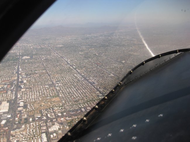 1.8 flight time, 1 ldg. DALT ~6500' - noticeably longer ground roll and flatter angle of climb. A pleasant 72F OAT at altitude. Used 8500' for return. Went a hair slower than the Aeroplanner plan, and cut off the last waypoint (TUS VOR) on return at the request of the controller. When I came around the ridge from Benson, he asked me to "resume own navigation direct Marana", so I cut the corner and went around the N side of Davis Monthan, and right over Don & Betty's house at First & River. It got HOT on descent (oat from 72 to 100F). Big wind at KAVQ - 15 kts at 150. I should have done a wheel landing - control was marginal in the "3 pointer" that I tried. Overall, not bad for the first long X-C, but that seat sure gets HARD.