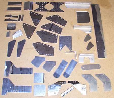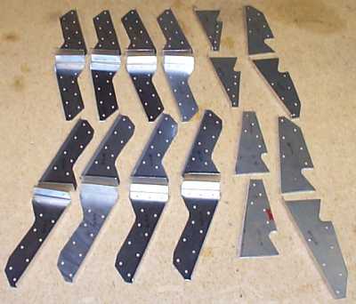 Proceeding by using scraps, these are some of the wing rib gussets. 16 more to go... I have found these easier to make cut to size & bent on the small brake rather than trimming the "bracket stock" as shown on the print. 9/9/00