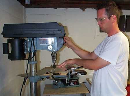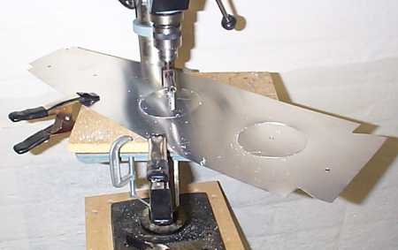 Proper setup for fly cutting rib holes - rib braced against post of drill press. Part can not rotate. Extensive clamping of part not needed. 9/25/00