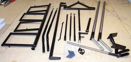 The majority of the welded parts. The gear legs are inserted into the axle fittings & tailwheel mount. Angle of this picture makes the tailwheel rod look as big as the mains. The mains are really a lot larger. Triangular weldment at top is for a single center stick. The rod ends (on the flap and aileron pushrods) are from Wick's. The elevator horn at right really should have been installed by now. 1/8/00