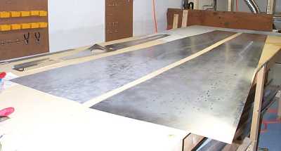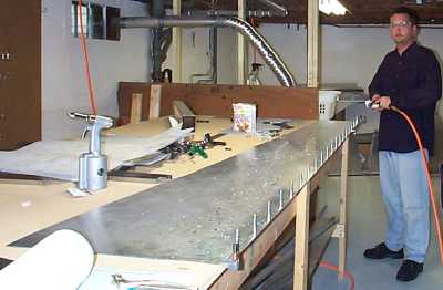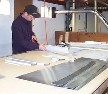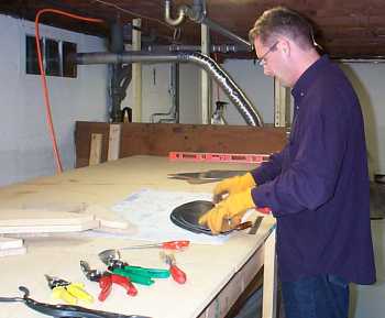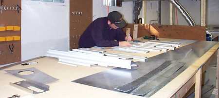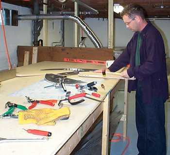 Using cardboard template to quickly mark the rivet pattern on the multiple frame members. Made 2 templates, used 6? places each. Saved a LOT of time measuring. 9/16/99