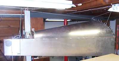 Aft fuselage hung from ceiling to work formers from below. Assembly is larger than basement hatch. T-deck will be fitted, and riveted outside or in garage. 10/13/99
