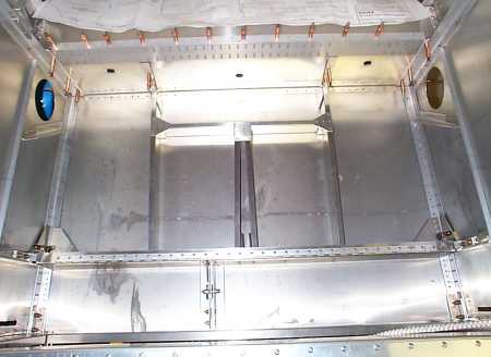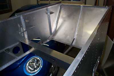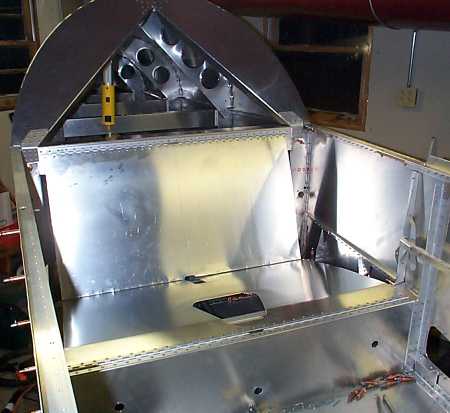 The aft cockpit structure. Parts just set in place. Similar to the tail, I will clamp these in position, trace around the perimeter of the parts, remove the parts, lay out the hole pattern within the traced lines, drill pilot holes in the cockpit bottom skin, clamp the parts back into position, then drill up through the bottom skin. With this process, holes are quite likely to be in the right position. 12/22/99