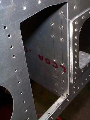 Drilled seatbelt brackets to 5/16, then I riveted the frames outside of the fuselage. Would be very difficult to rivet these in place. 12/27/99