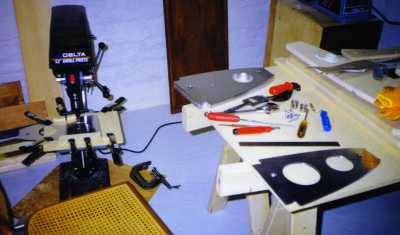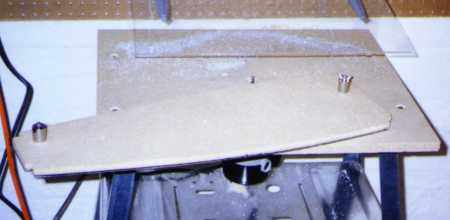 Setup for trimming the aft wing ribs to size on the table router. Held rib blank to pattern block using the bolts for holding the rib blanks between the form block & backing block. Sockets on bolts used as handles. Used laminate edge trim bit (1/4" dia) to cut rib blanks. For doing 26 ribs, the process of making the form block and setting up the router may not be worth the trouble. But it is very fast once set up. 8/7/99 (posted 11/21/99)