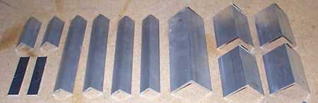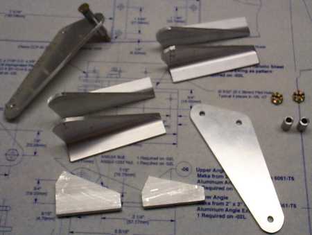 Main spar details. Now that I've got a good feel for the bandsaw, hacking up bits of angle goes quickly. I took all of these (except the blocks) from the 11/21/99 picture above to here in about 4 hours. 2/7/00