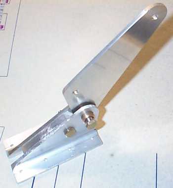 Another view of aileron bellcrank assembly. Another reason I only completed one at this time is I trashed one of the bushings installing it into the aluminum part. I got it out-of-round, and tried to re-round it by squeezing it with pliers. After a few iterations of that, I discovered that when you get one of these things out of round, it's never going back. I'll just order another bushing with the bolt. (These assemblies require hours of trial fitting to get to work right. They are frustrating to make - enough so that I looked at what other airplanes use - RANS, Lancair, etc. They use riveted-flange bearings for bellcranks - much less fuss to install, perhaps, but these are much less $$$, much smaller, lighter, and other than the frustration of manufacture, are simpler.) 2/9/00