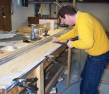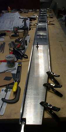 The intimidation factor of the $100/ea. spar cap extrusions I found is not as bad as the intimidation factor of the main gear legs. Sure, the gear legs require "only" 2 holes each, but I've decided they will be done by a pro - no matter what I have to bring to a machine shop (engine mount, gear legs, axles, etc.). The spar caps are just long cuts using your favorite bandsaw - just 6061 like I'm used to cutting by now. True, I went through 3 blades, but it is 80-odd feet of cut through 3/16-5/16 material, and I didn't want to fuss with a dull blade just to get a few more feet of cut out of it. Blades are ~$8 each - replace often. 2/17/00