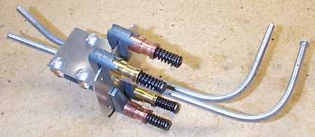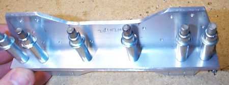 Pitot-static assembly showing the stacks of washers that are very frustrating to install after the brackets are riveted to the mount plate. The tubes have to be removed to clear the rivet gun - maybe the clamp & washer stacks could be left in place, but I found the tubes impossible to guide through the mount plate & the clamps. 1/29/00