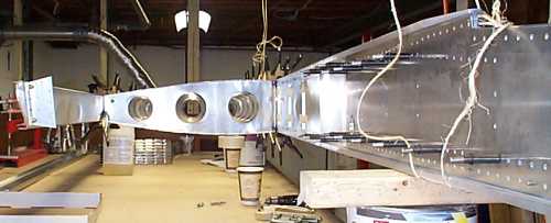 View down the lightening hole. Even here, I see the need to square the wing for skinning - the spar twists easily, and the ribs go with it. (Spar tip was removed for drilling - spacer not in place in this view.) 5/16/00