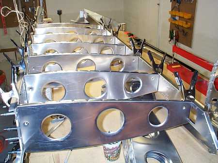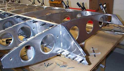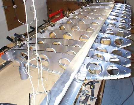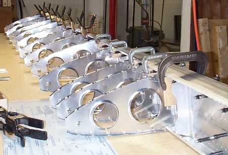 After drilling. Ribs clecoed in place. Drilling was done with spar above table to allow use of spring clamps top & bottom. Spar was rotated from this view with ribs over the table for easy drilling access. Spar was also loosely suspended from ceiling with twine to prevent it falling off the supports. 5/16/00