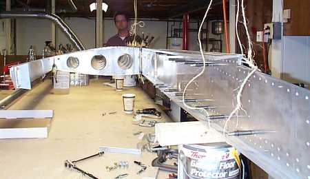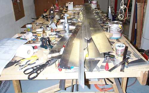 View from outboard end of right wing, wing structure upside down. Small strip of metal on table (with tape) is extra rib spacer - not needed for the last rib because the tip triangle fits in there. Shows how slick this airfoil is. 5/18/00