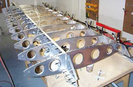 From here, I had to do some refinement of the inner ribs at the spar (shape to fit under spar cap flanges). 5/17/00