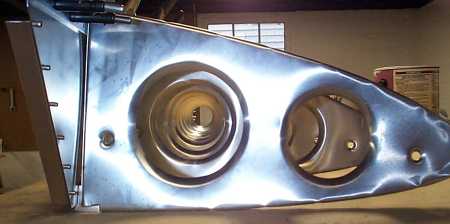 Tip structure - triangle of tip web is on opposite side of spar from main web. White at rib-spar interface is masking tape I used to retain rib spacers for aft ribs for drilling. I expect that lining up the holes through the forward & aft ribs and 2 spacers with the holes in the spar web for riveting (without leaving masking tape riveted between the layers) will be tricky. 5/18/00