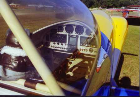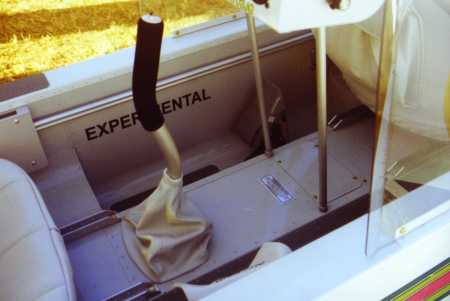 Cockpit of CH601. Note center stick with 2 grips. Forward-swing canopy. They showed one of these last year with double-hinged (opens either side) canopy. 4/23/00.