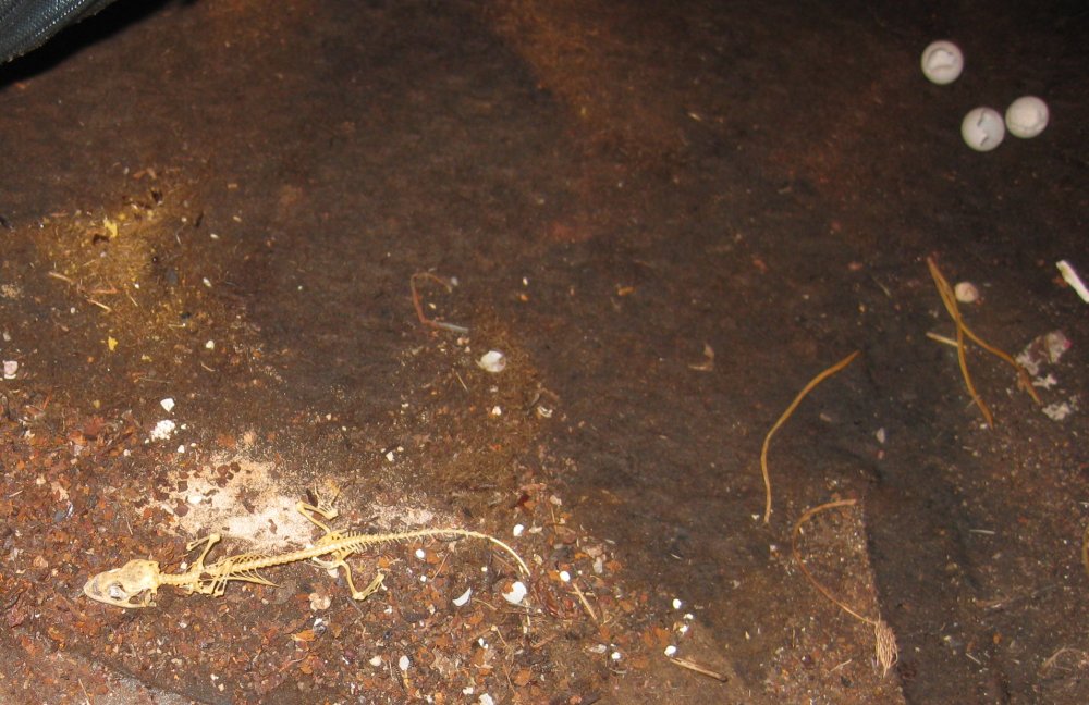 Decided to try pulling the back seat to see what's under there and what the rear floor looks like. Under the back seat, found a lizard skeleton and what might be several generations of lizard eggs. The back seat has an outer tab that can be seen in the door openings. These have to be un-bent to release the seat. It also has 2 tabs on the bottom of the seat back that have to be un-bent to release the seat. This is different from the '55, which is held in by tension and can be removed and reinstalled without bending anything.