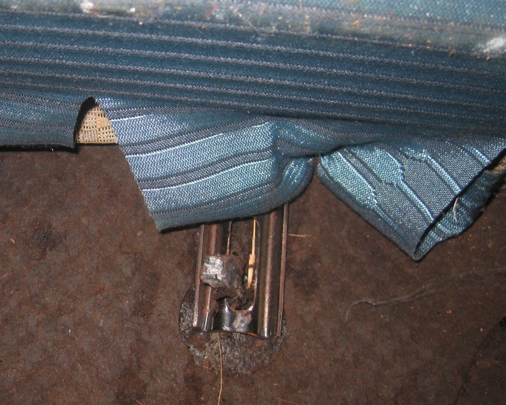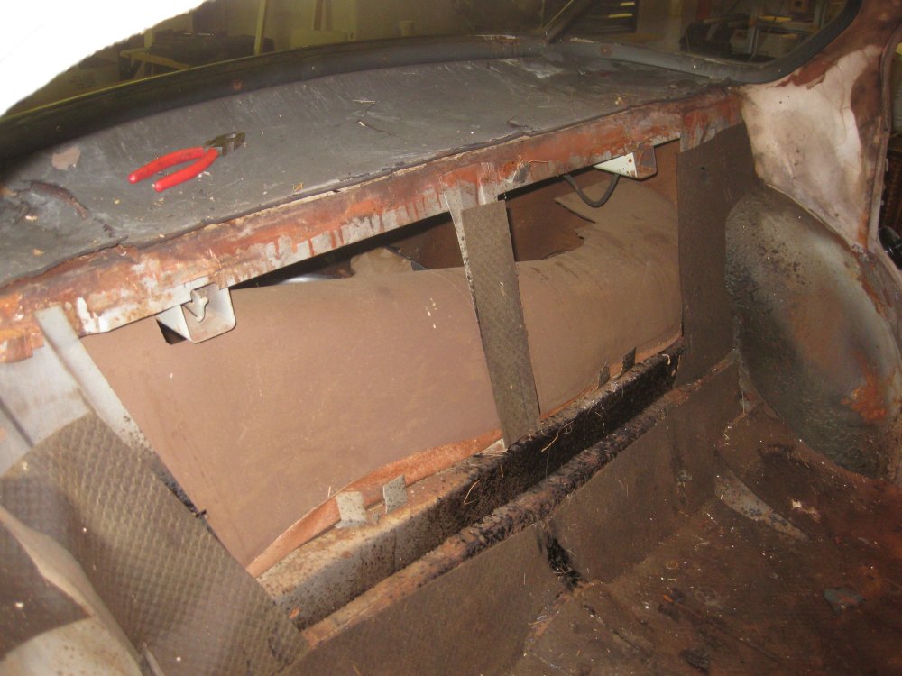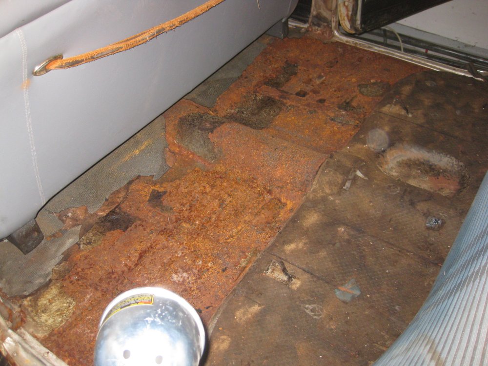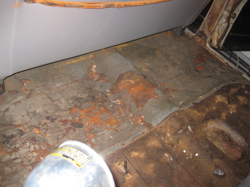 Found the floor to be pretty solid under the back seat itself. Pulled out the broken-up crispy rubber floor mat and the "filler" material between the corrugations in the floor forward of the back seat. The sheet metal there has quite a few holes. Will need to replace this.