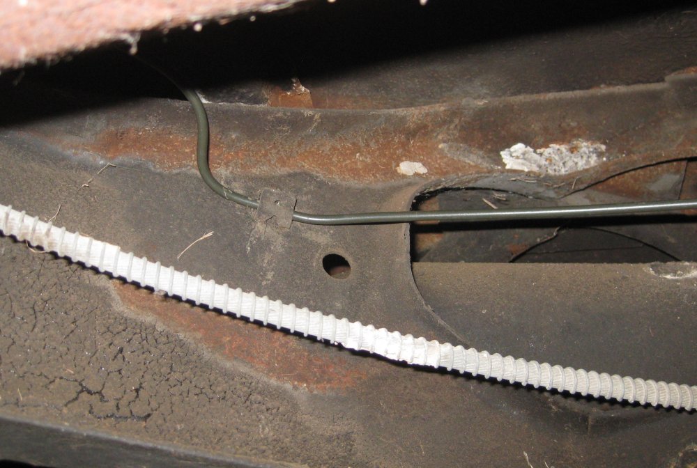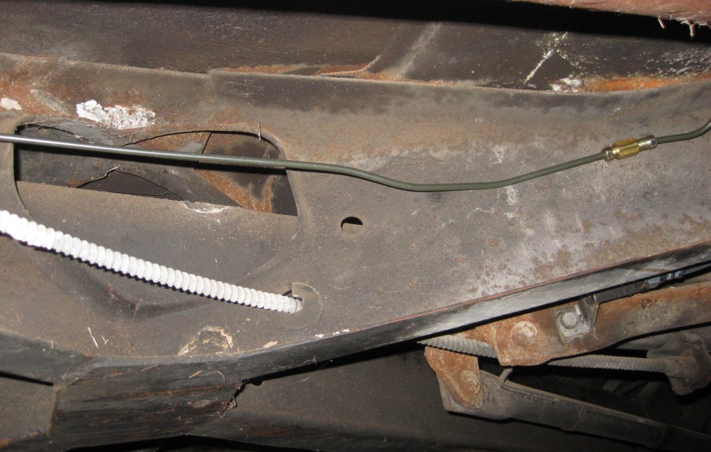 Got a 60" pre-made section w/ fittings flared onto each end. Got a 12" section to make up the difference. Bent the 60" section using the original as a pattern. It fint in pretty well. The photos here are from front to back. That hole in the floor was convenient for getting the line into the clip on the frame. The most aft segment needed some S-bends to take up the extra length.