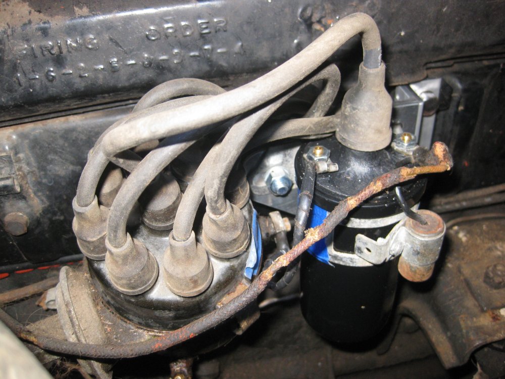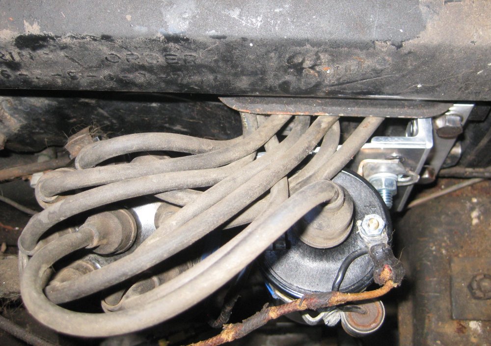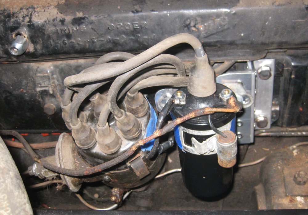 Not sure why I'm listing this out of order - I checked back through my AACA Buick Forum postings to get the dates for this whole page. I swapped out the ignition coil for a new one. The old one had a short and an open (incorrect) between the terminals. Also, Buick mounted these coils horizontally. As an oil-filled can with a void or bubble inside, this can lead to the high side of the coil getting hot. So I wanted to come up with a bracket to mount the new coil horizontally, if possible.