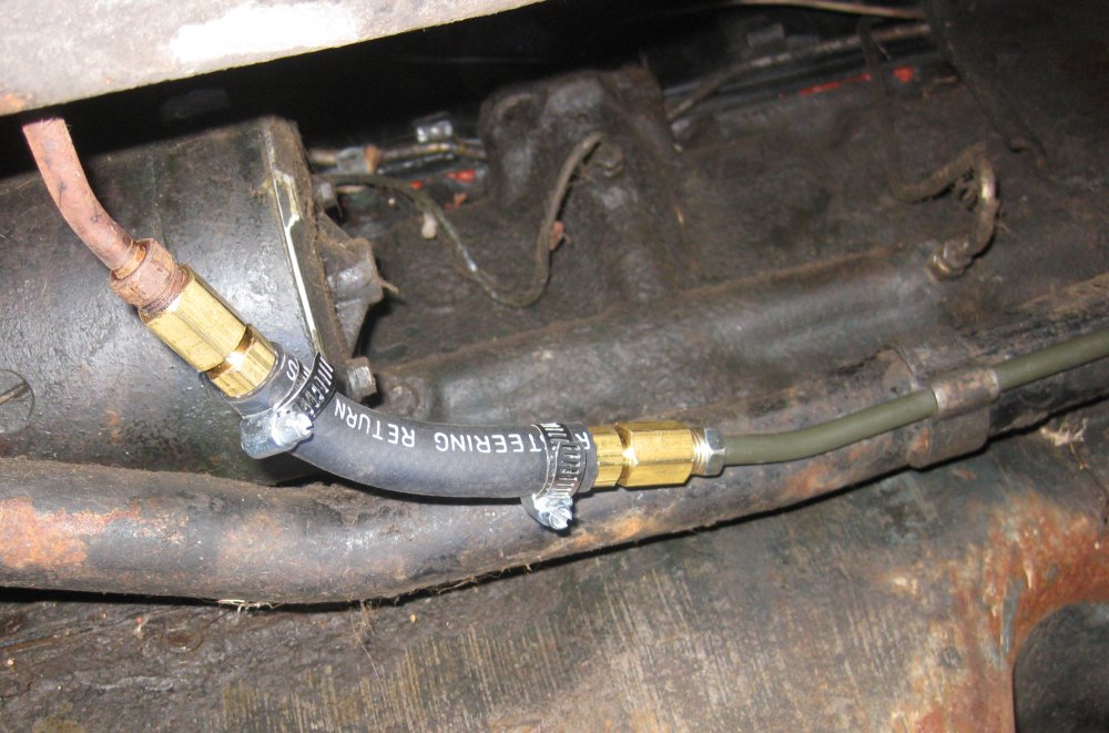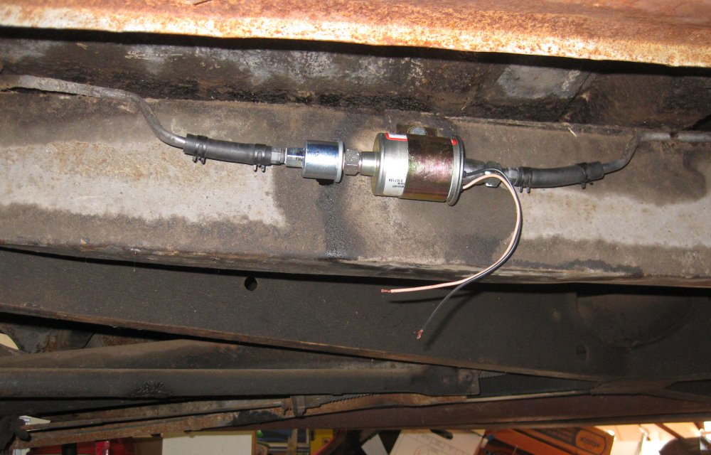Installed an electric helper pump along the right frame rail (after requesting input from the AACA Buick forum as to where to put it). The frame rail is pretty convenient for access. I couldn't clearly see a spot up by the tank where the suspension might not interfere.