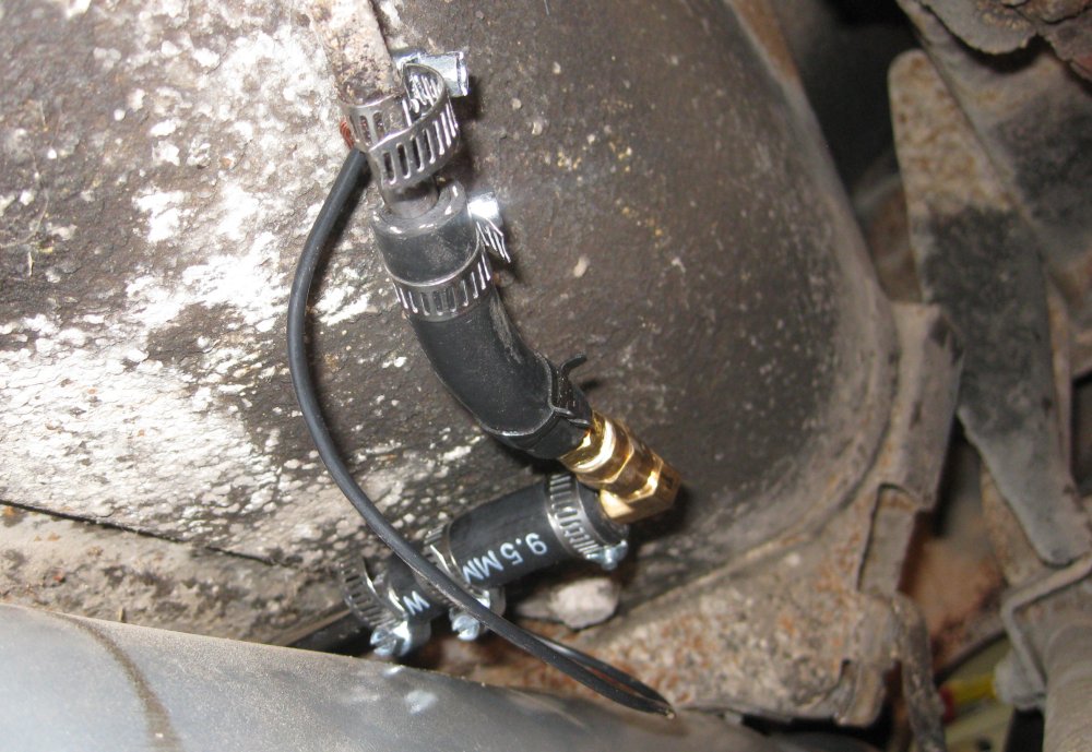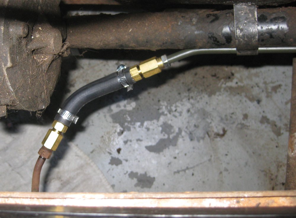 Came up with a collection of fittings from the hardware store that adapt 5/16" hose on one side, a 90 elbow, and 3/8" hose on the other side to connect the frame tube to the tank tube. Also put a jumper wire across this because the jumper wire is the ground for the level sender.