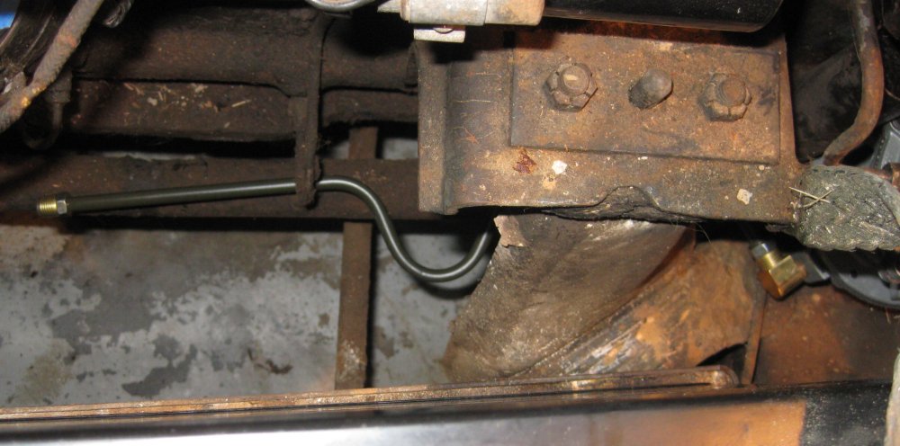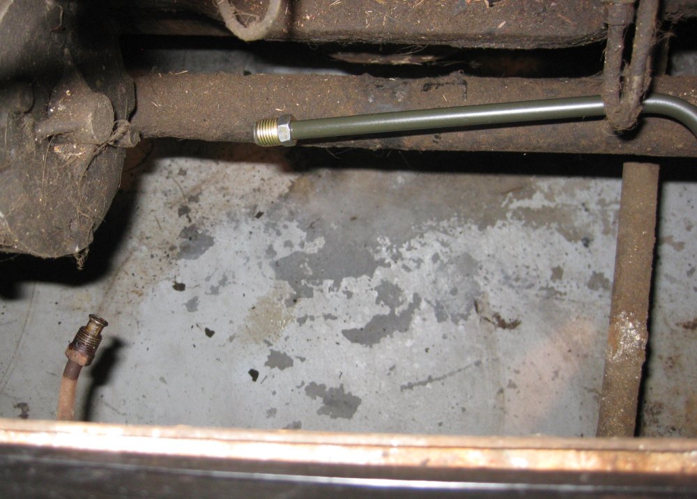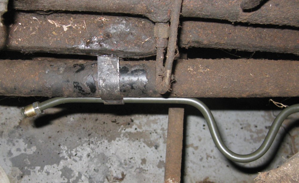 Bought the next-longer length of bend-your-own tube from the auto parts store, and bent up a fair replica of the hard tube along the side of the engine. Mine has an extra U in it to take up extra length. I didn't mock this up - just made the bends, and it came out nearly perfect.