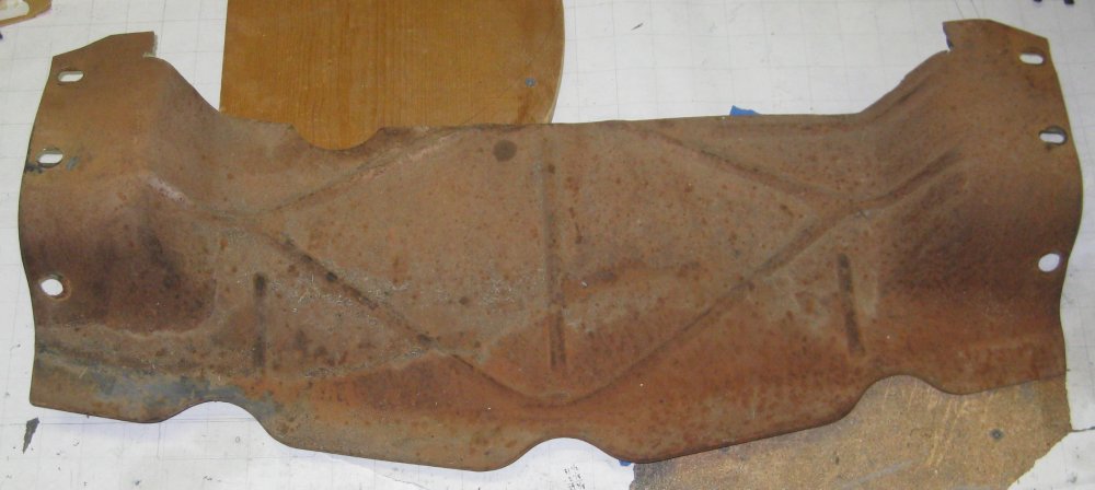 Some call this a splash pan, but I believe it's really to not let the air that comes in through the grille just pass out under the car. It seals up the area in front of the radiator. I bought a paint removal wheel at the auto parts store & ran it in a drill motor to clean off the paint from the top side of this pan. I didn't do the bottom.